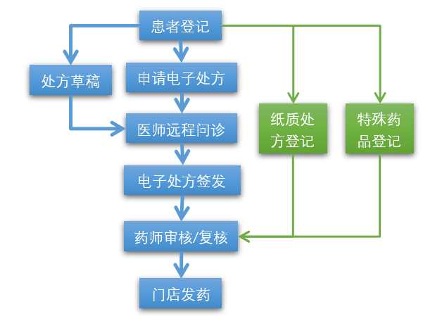 - 处方录入:门店药师录入处方信息,并进行处方拍照;如果没有纸质处方,则发起电子处方流程,向互联网医院申请电子处方;
